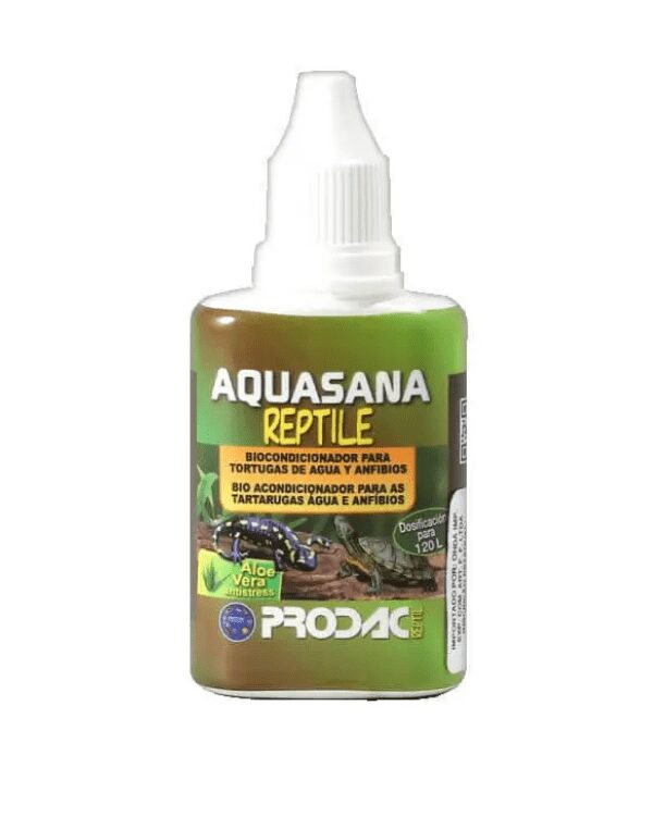 Aquasana Reptile é um acondicionador para tratamento de água para as tartarugas de água e anfíbios, essencial para remover o cloro e cloraminas da agua da torneira, anular os efeitos de metais. Além disso, contém aloe vera, um coloide natural especial que protege as tartarugas de agua e anfíbios. Também atua eficazmente como anti-stress.