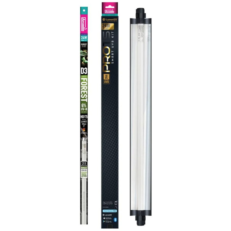 O kit LumenIZE Pro T5 UVB, D3 Forest, 6% UVB é a primeira lâmpada T5 regulável controlada por aplicação do mundo. Está disponível como parte da nova linha LumenIZE da Arcadia, que coloca um grande foco na eficiência energética e na facilidade de uso. Arcadia é o fabricante líder em lâmpadas técnicas para répteis. Este kit específico é ideal para espécies que vivem em floresta tropical e está disponível em três potências diferentes: 24W, 39W e 54W.