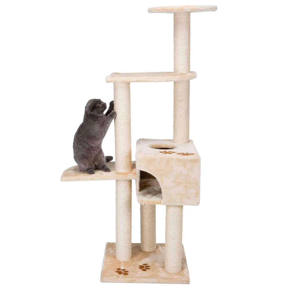 Este produto foi concebido essencialmente para gatos aventureiros, que gostam de arriscar, escalar e trepar. É forrado em pelúcia (poliéster) e possui postes envoltos em juta, para o animal afiar as suas garras. Conta com diversas plataformas a diferentes alturas e com um acolhedor nicho forrado em pelúcia, o refúgio perfeito para qualquer gato. De estrutura simples, este produto trará ao seu gato o local ideal para descontrair no seio familiar.