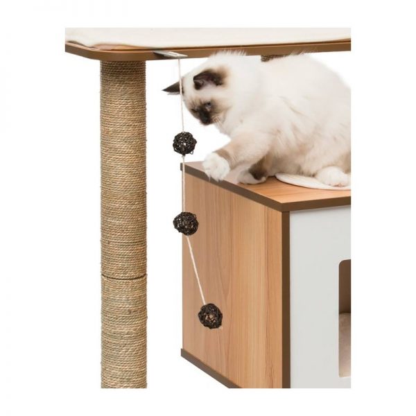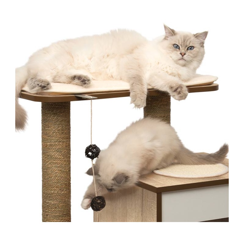 A combinação V-BASE de algas marinhas, tábuas de média densidade e cor esbranquiçada faz com que esta peça de mobiliário tenha uma aparência viva e robusta. O V-BASE é o local ideal para os gatos brincarem e descansarem.