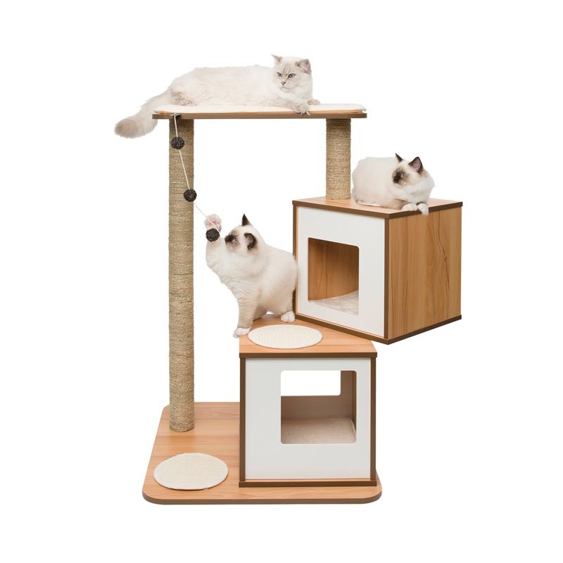 O Vesper V-Double é perfeito para 2 ou mais gatos, já que seu design de vários níveis oferece diferentes espaços para brincar, descansar e pular. Para descansar, a mobília tem almofadas de espuma de memória e uma capa de pelúcia recheada. E para jogar, bolas de vime, além de raspadores.