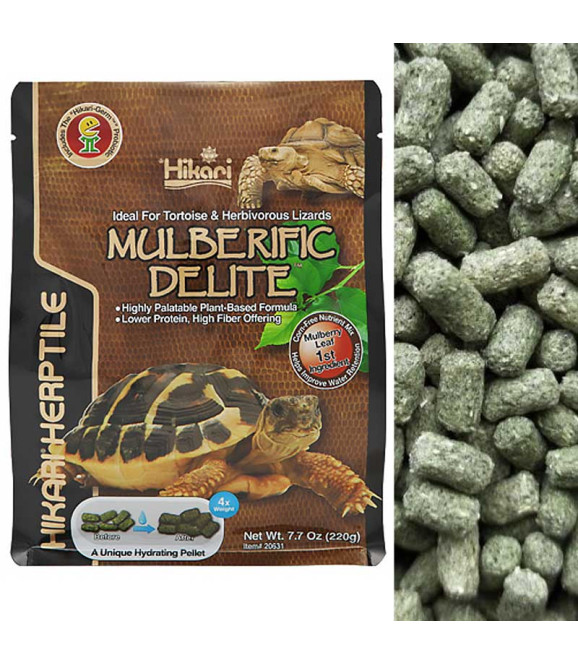 Para melhores resultados, mergulhe os pellets em água fresca e pura por pelo menos 5 minutos antes de alimentar. Isso permite que cada pellet se hidrate completamente e adquira a textura preferida. O pellet ficará 4 vezes mais pesado quando completamente encharcado. Enquanto Mulberific Delite™ se destina a ser um alimento exclusivo; muitas tartarugas herbívoras também gostam de gramíneas ou vegetais selvagens e os habitantes da floresta gostam de frutas, todas as quais podem ser alimentadas, se desejado, mas afetarão o perfil nutricional ajustado da dieta, reduzindo assim seus benefícios.