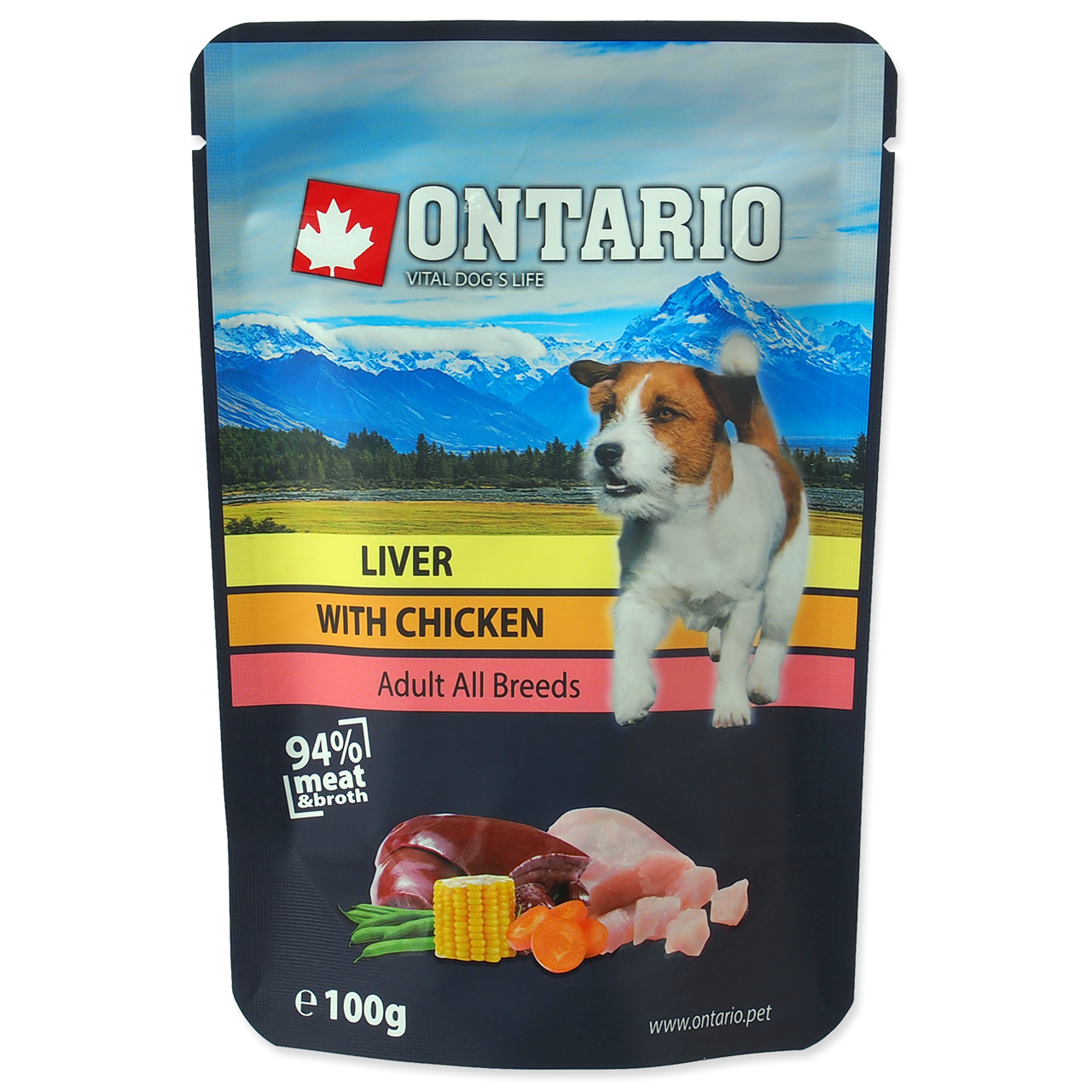 Alimento complementar para cães adultos e cachorros a partir dos 2 meses com carne de frango e fígado em caldo .