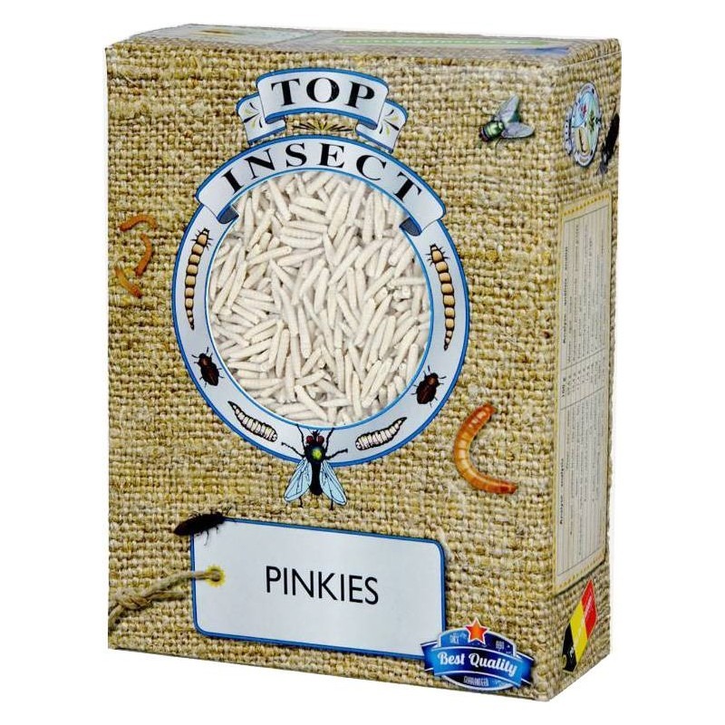 Os Pinkies são os insetos congelados mais comumente usados. Quando os pássaros podem escolher, eles geralmente mostram uma forte preferência por este inseto. É um verme com pele macia e um sabor delicioso. Pinkies são larvas da pequena mosca verde.