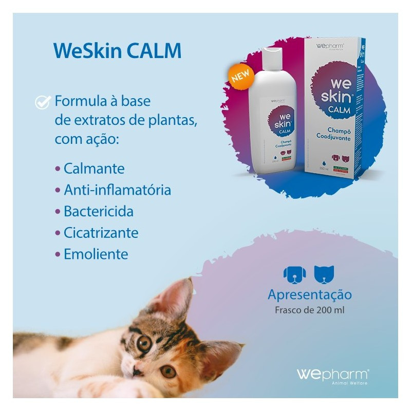 WeSkin® Calm Champô é um Coadjuvante de ações de tratamento em situações de dermatites pruriginosas, proporcionando um efeito calmante e regenerador da pele em cães e gatos.